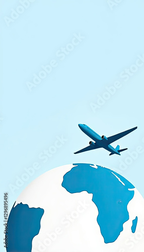 Simple Flat Illustration of an Airplane Flying Over the Globe in Blue and White Tones, Symbolizing Travel and International Tourism
