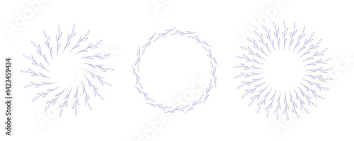 Simple flower circle frame set. Hand drawn blue round line border, leaves and flowers, wedding invitation and cards, logo design and posters template. Elegant minimal style floral isolated set