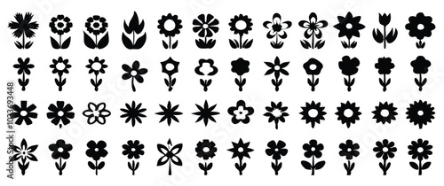 Simple Flower Icons in SVG Black Silhouettes, Featuring Minimalist Floral Shapes on a White Background, Perfect for Graphic Design and Digital Projects