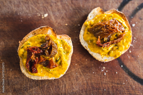 simple food ingredients, bread slices with sweet potoato and kale dip topped with sundried tomatoes