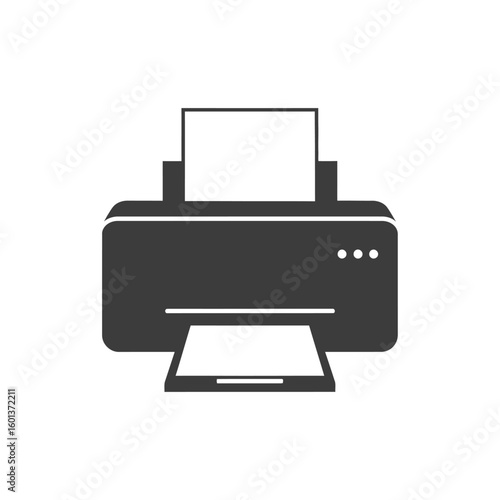 Simple graphic illustration of a printer with paper loaded, isolated on a white background, in a minimalist style.