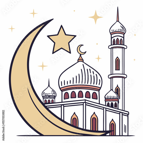 Simple Line Art Illustration of a Mosque Under a Crescent Moon