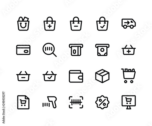 Simple Set of E Commerce Related Vector Line Icons. Contains such Icons as shopping bag, discount, store, label and More. pixel perfect vector icons based on 32px grid. Editable Strokes