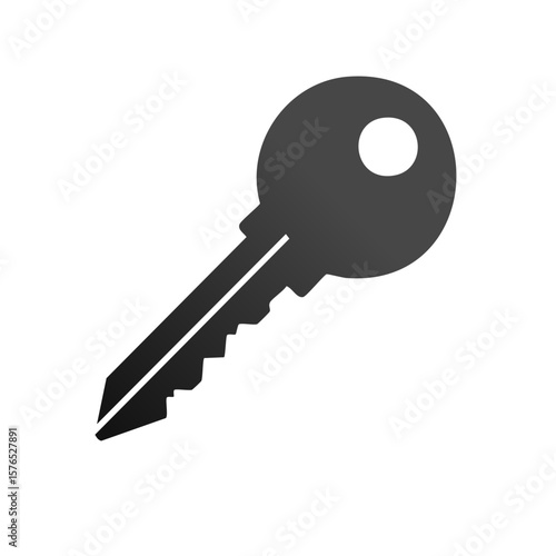 Simple silhouette of metal door key for security, access, or entrance in dark grey