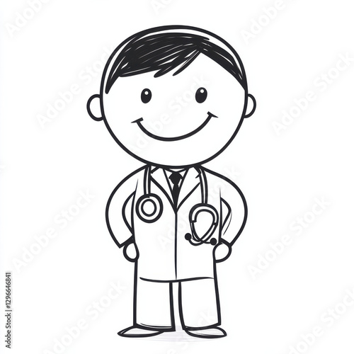simple stick figure doctor with friendly smile, wearing lab coat and stethoscope