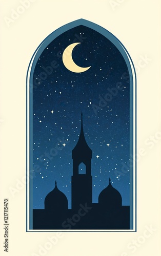Simple vector graphics, label design, a mosque silhouette in an arched window at night with stars and a moon above it, minimalist style, a blue gradient background,