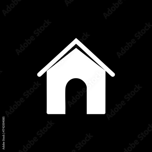 Simple white house icon with arched entrance on black background minimalist vector graphic.