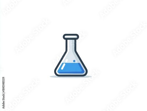 Simplified illustration of a chemistry flask filled with a blue liquid against a bright white background. Graphic design of lab equipment