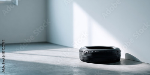 Single black car tire placed on smooth concrete floor in bright minimalist room with natural light and shadows
