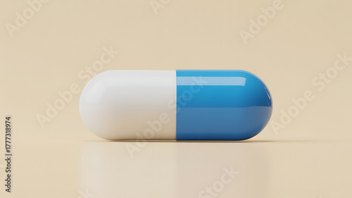 Single blue and white capsule lies horizontally against a tan colored background, medication is visible