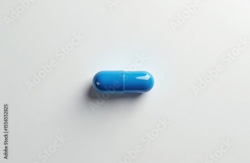 Single blue capsule on white background. Conceptual photo for vitamins, medications, healthy lifestyle, microelements, healthcare. Pharmaceutical product for treatment, prevention. Perfect for banner
