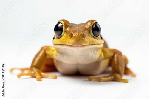 Single brown frog on stark white backdrop, textured skin, macro, isolated