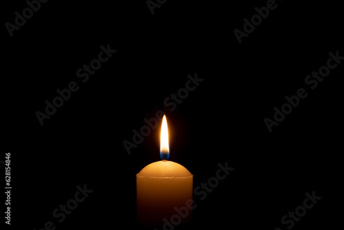 Single burning candle flame or light glowing on a big white candle on black or dark background on table in church for Christmas, funeral or memorial service with copy space.