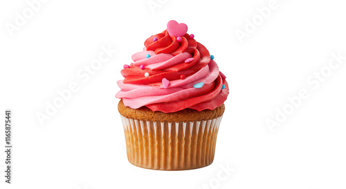 Single Cupcake with Red and Pink Icing and Tiny Heart Topping on Transparent Background.