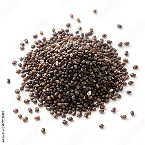 Single dried chia seed isolated on white background, highlighting its tiny size, speckled texture,