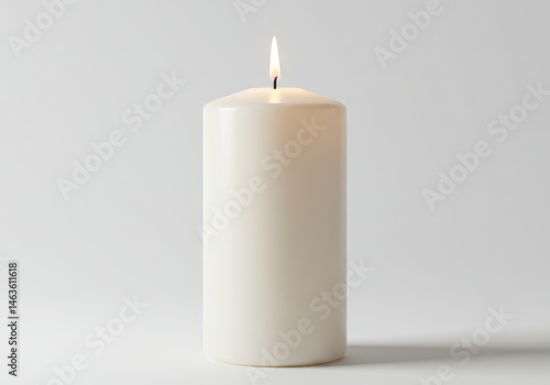 Single ivory pillar candle burning with a small flame against a neutral background