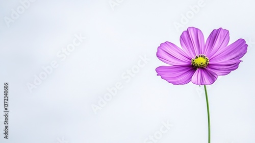 Single light purple cosmos flower with yellow center, on a light blue background. Minimalist floral image with copy space.