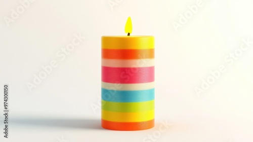 Single Lit Striped Candle on White Background