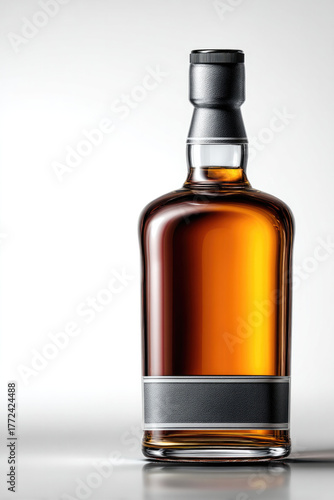 Single malt whiskey bottle with elegant black label, amber liquid, glass packaging, modern style, isolated on white background