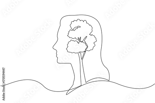 Single one line drawing head of woman with a large plant inside. Thinking about greening the earth. Continuously caring. International Day of Plant Health. Continuous line design graphic illustration