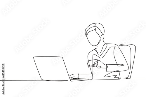 Single one line drawing young man sitting on chair and typing entering credit card code on laptop around desk. Digital payment concept. Modern continuous line draw design graphic vector illustration