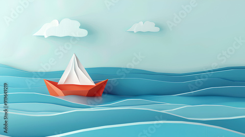 Single paper boat on still water, paper boat drifting in the middle of the sea with waves, 3d rendering, Generative AI