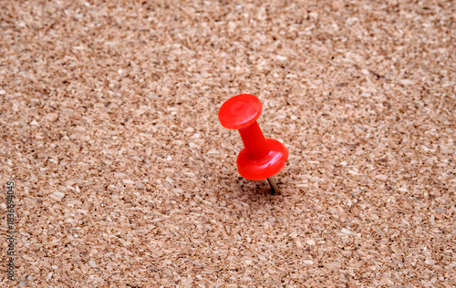 Single red push pin makes a crucial mark on the textured cork bulletin board. Highlighting an important memo area on the wooden wall, leaving most of the surface empty for future additions.