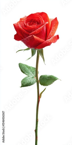 Single Red Rose with Dew Drops on White Background
