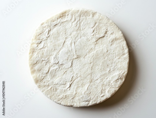 Single Uncooked Flour Tortilla on White Background, Rough Texture and Rustic Appearance, Ideal for Wraps, Tacos, and Mexican Cuisine, Simple and Versatile Ingredient