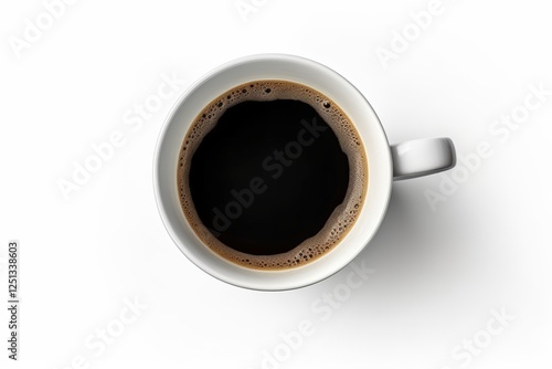 Single White Coffee Cup with Hot Black Coffee on a Smooth White Surface, Top View Perspective Capturing Rich Aroma and Texture of Beverage