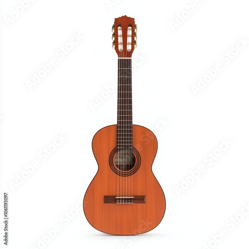 Single wooden guitar on white isolated background, showcasing craftsmanship and design.