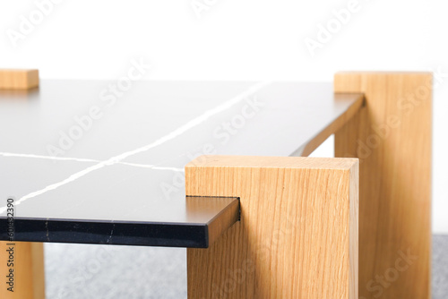 Sintered Stone Quartz Top Coffee Table with solid woods legs. Isolated on a white background.