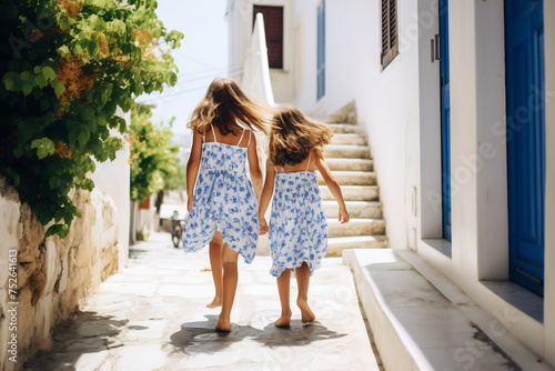 Sisters Hand in Hand Exploring Traditional Greek Island Alley. Family Travel and Cultural Discovery Concept