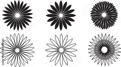 Six abstract floral or starburst graphic elements in black and white