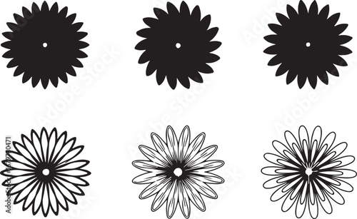 Six abstract floral starburst shapes in black and white