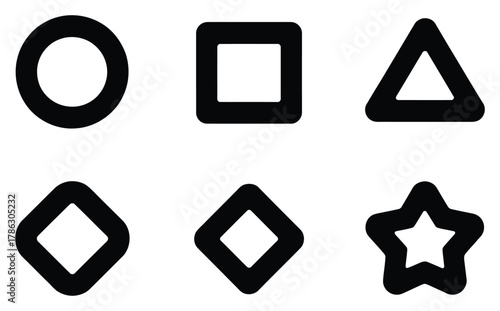 Six black geometric outline shapes with rounded corners, circle, square, triangle, rhombus and star