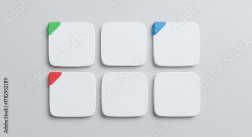 Six blank white square sticky notes with colored corners arranged in a grid on a gray background