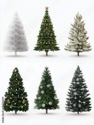 Six Christmas Trees in Different Styles and Types on a Plain White Background, Featuring High-Quality Designs in Neutral Tones