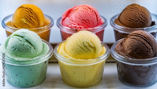 Six delicious scoops of ice cream in individual cups.