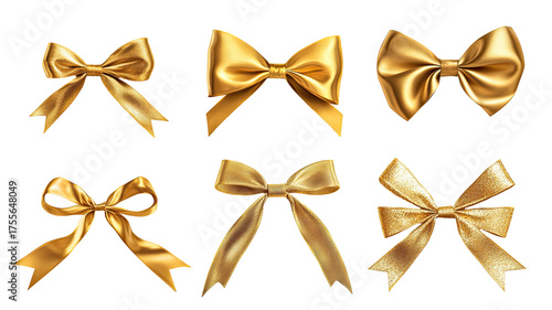 Six gold bows, different styles, on a black backdrop