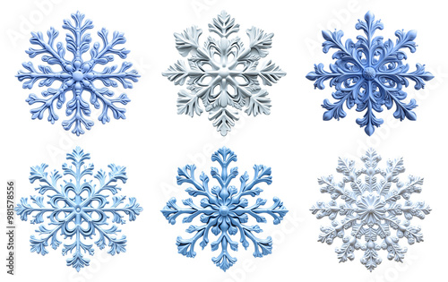 Six intricate blue and silver snowflakes isolated on transparent background