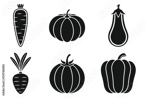Six silhouette vegetables including carrots pumpkins and eggplant