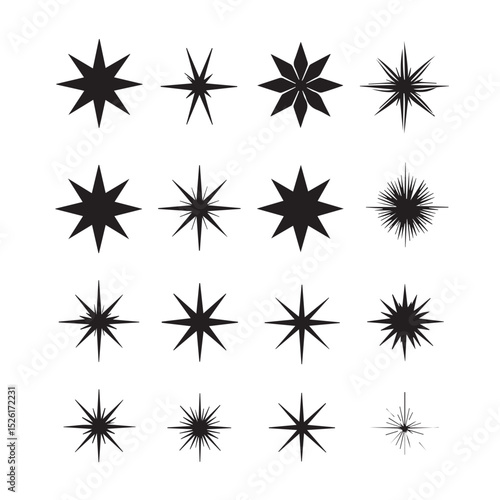 Sixteen black starburst shapes graphic design elements