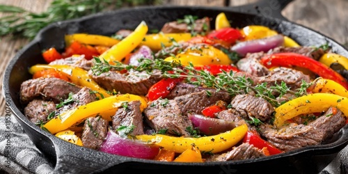 Sizzling skillet of colorful fajitas: A vibrant dish with a rich display of ingredients