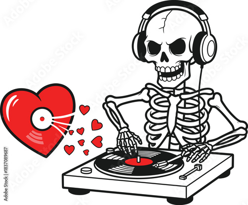 Skeleton DJ with Headphones Playing Vinyl Record with Heart Shapes for Valentine Day