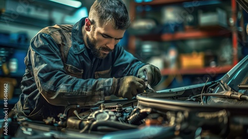 skilled mechanic repairs car engine in gritty auto shop dramatic industrial photograph