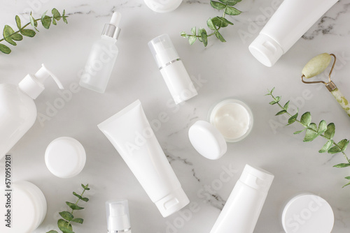 Skincare products concept. Top view photo of white cosmetic bottles, cream jars, dropper bottles, face massage roller and eucalyptus leaves on marble background. Cosmetics mockup idea.