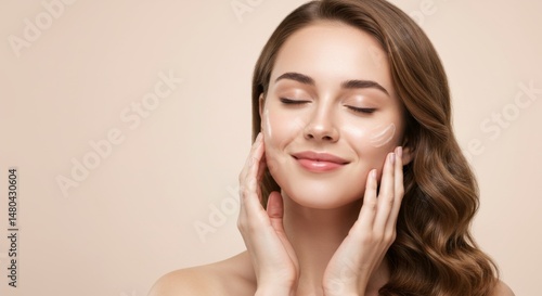Skincare routine concept with a smiling woman applying moisturizer for healthy skin care and beauty