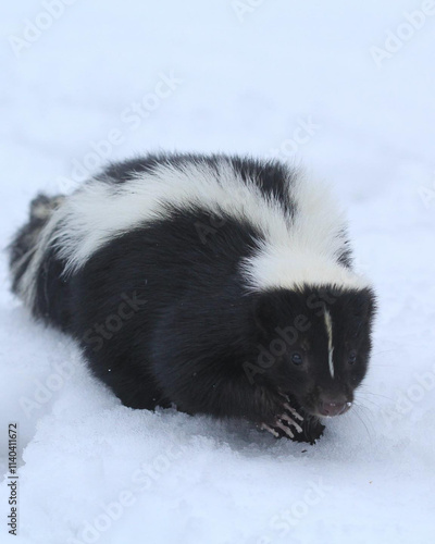 Skunk navigating through deep snow, its distinctive black and white markings vivid against the wintry backdrop, capturing a moment of wildlife in a cold setting.