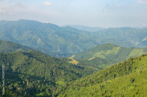 Sky, forest and mountains.